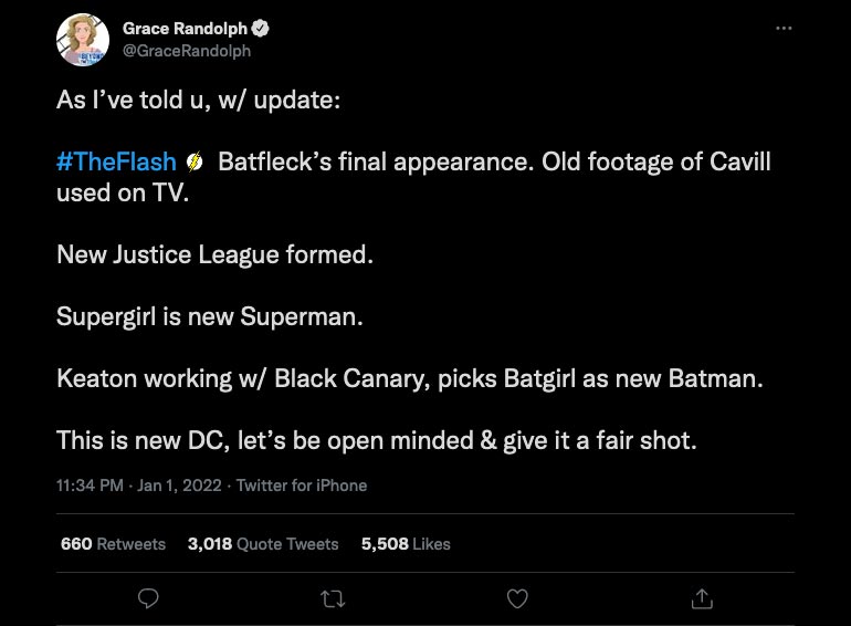Pada tanggal 1 Januari 2022, kritikus film Grace Randolph memberi bocoran di Twitter soal rencana Warner Bros dan DC terhadap film The Flash. Ia menyebutkan kalau film itu akan menjadi kemunculan terakhir bagi Batfleck (Batman versi Ben Affleck) dan Superman (diperankan Henry Cavill).