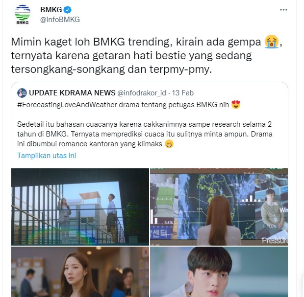 Menariknya, media sosial resmi BMKG juga ikut meramaikan diskusi dari serial Forecasting Love and Weather. Dalam sebuah cuitan, BMKG sampai berkomentar terkait apakah drama tersebut realistis atau tidak. Menurut BMKG, drakor Forecasting Love and Weather sukses menggambarkan pekerjaan mereka dalam memperkirakan cuaca. “Pada kenyataannya, memperkirakan cuaca itu nggak mudah. Apalagi di Indonesia kita punya geografis kepulauan yang tertetak di dua benua serta dua samudera,” tulis admin BMKG sangat mengomentari drakor Forecasting Love and Weather.